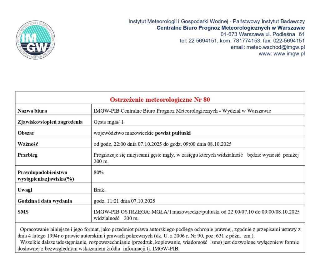 Nazwa biura IMGW-PIB Centralne Biuro Prognoz Meteorologicznych – Wydział w Warszawie Zjawisko/stopień zagrożenia Gęsta mgła/ 1 Obszar województwo mazowieckie powiat pułtuski Ważność od godz. 22:00 dnia 07.10.2025 do godz. 09:00 dnia 08.10.2025 Przebieg Prognozuje się miejscami gęste mgły, w zasięgu których widzialność będzie wynosić poniżej 200 m. Prawdopodobieństwo wystąpienia zjawiska(%) 80% Uwagi Brak. Godzina i data wydania godz. 11:21 dnia 07.10.2025